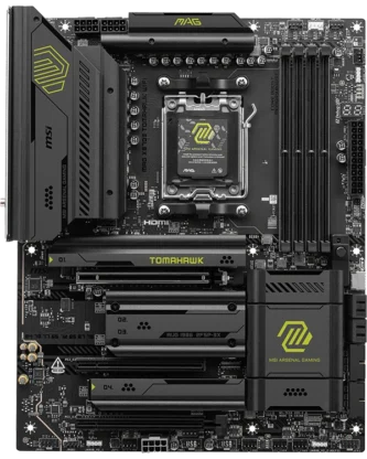 Het MSI MAG X870E TOMAHAWK WIFI is een robuust moederbord met een prachtig ontwerp van groen/gele tinten in combinatie met zwart. Verder beschikt het moederbord over 5 Gbit LAN, genoeg USB 3.2 poorten en 2x razendsnelle USB4 type-C poorten.